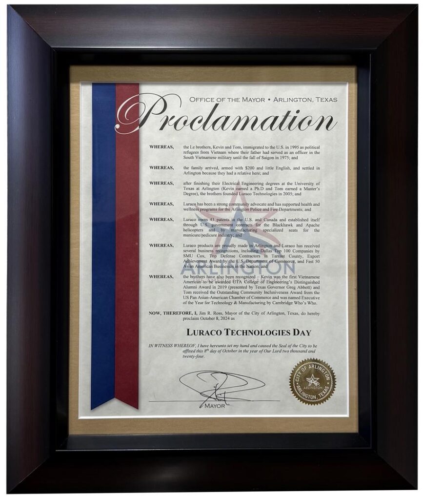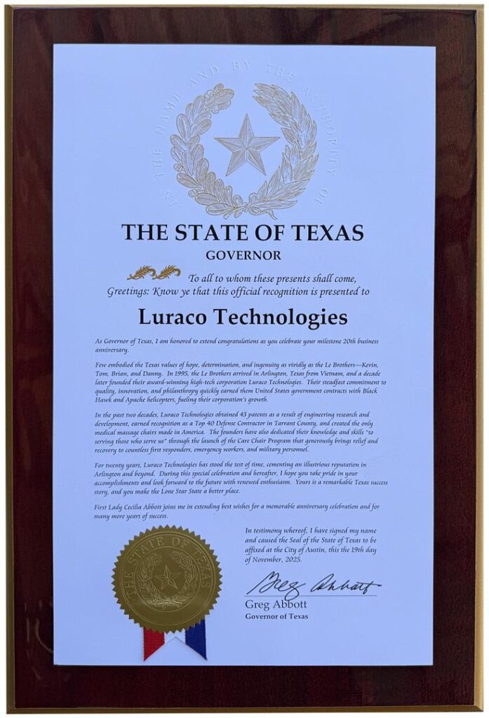 Luraco has been recognized with distinguished awards including New World Report’s “Best Advanced Research Technology Company in Texas ”, “CES Mark of Excellence” by the Consumer Technology Association, “Top Medical Massage Chair and Equipment” by Hollywood Aesthetic Everything, “Export Achievement” award by the U.S. Department of Commerce and the Small Business Administration, a recognized member of the “Made in America Movement”, one of Dallas’s “Top 100 Companies”, “Top Defense Contractor in Tarrant County” as well as many accolades for the various products we make.
